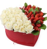 Cutie Inima cu 21 Trandafiri Albi si Capsuni.