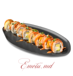 Orez, Țipar și Daikon, cream cheese, castraveți, somon, sos picant și Teriyaki, ceapă verde, omletă Tomago.