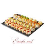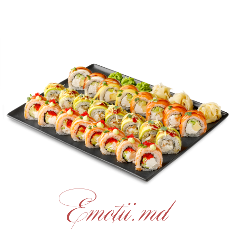 Avanaghi sushi roll - Orez, Țipar și Daikon, cream cheese, castraveți, somon, sos picant și Teriyaki, ceapă verde, omletă Tomago.