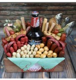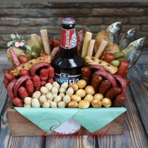 Box, imported beer, dry-salted fish, cheese in assortment,